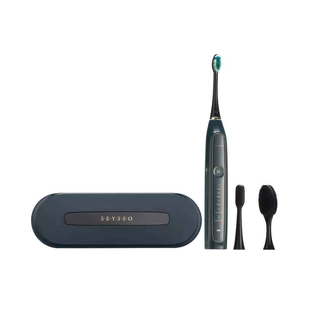 A gdyby tak szczoteczka soniczna zadbała kompleksowo nie tylko o Twoje zęby, ale również o czystą skórę twarzy? Teraz jest to możliwe, dzięki nowoczesnej szczoteczce SEYSSO Gold Forest Green, która łączy wszystkie te możliwości w jednym urządzeniu. Wystarczy, że wybierzesz odpowiednią końcówkę, program dopasowany do Twoich potrzeb i włączysz urządzenie. Całą resztę pracy szczoteczka SEYSSO Gold wykona za Ciebie - albo dokładnie wyczyści Twoje zęby albo oczyści i wymasuje Twoją twarz. Całość została wykonana z niezwykłą starannością. Szczoteczka jest nie tylko bardzo funkcjonalna, ale również zachwyca przepiękną kolorystyką w barwach głębokiej, ciemnej zieleni z subtelnym złotym wykończeniem. Poznaj więcej zalet i możliwości najnowszej szczoteczki sonicznej SEYSSO Gold Forest Green.