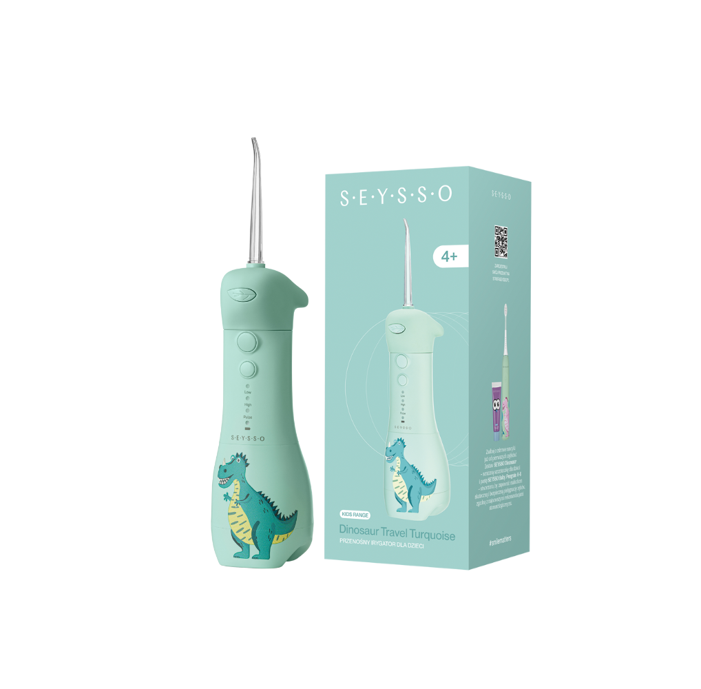 SEYSSO Kids Dinosaur to irygator stworzony z myślą o dzieciach powyżej 4. roku życia. Dzięki swojemu przyjaznemu wyglądowi i łatwej obsłudze zachęca najmłodszych do regularnego dbania o higienę jamy ustnej. Urządzenie oferuje trzy tryby pracy – delikatny, standardowy i pulsacyjny – które pozwalają dostosować intensywność strumienia wody do indywidualnych potrzeb dziecka. Jego kompaktowe wymiary oraz lekka konstrukcja sprawiają, że świetnie sprawdzi się zarówno w domu, jak i w podróży. Wytrzymała bateria litowo-jonowa zapewnia do 90 minut pracy po pełnym naładowaniu, a ładowanie przez kabel USB C jest szybkie i wygodne. Dioda LED wskazuje poziom naładowania, co ułatwia codzienne użytkowanie. Wysoka klasa wodoszczelności IPX7 gwarantuje bezpieczne korzystanie w łazience. Do zestawu dołączone są dwie wymienne końcówki SEYSSO Dinosaur Standard, które zostały zaprojektowane z myślą o delikatnych dziąsłach dzieci. Ten innowacyjny produkt wspiera zdrowy rozwój jamy ustnej Twojego dziecka, skutecznie usuwając resztki jedzenia i płytkę nazębną z przestrzeni międzyzębowych. Bezpieczny, wygodny i atrakcyjny wizualnie SEYSSO Kids Dinosaur to idealny wybór dla każdego małego odkrywcy!